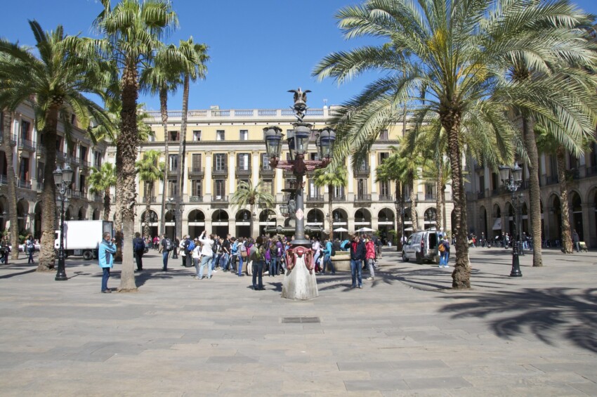 Ombreggiata da altissime palme e circondata da severi palazzi dell’Ottocento, Plaça Reial è una delle piazze più emblematiche di Barcellona, ottimo punto di partenza per una serata fuori. E’ una piazza con la tipica forma quadrata spagnola, con portici ad arco sotto i quali ci sono perlopiù ristoranti e tapas bar, molto turistici ma senza dubbio meno rispetto a quelli delle vicine Ramblas. Durante la bella stagione (e quindi praticamente tutto l’anno!) mettono i tavolini all’aperto, che da sotto i portici “sconfinano” fino in mezzo alla piazza, creando un’atmosfera gioviale e calorosa.